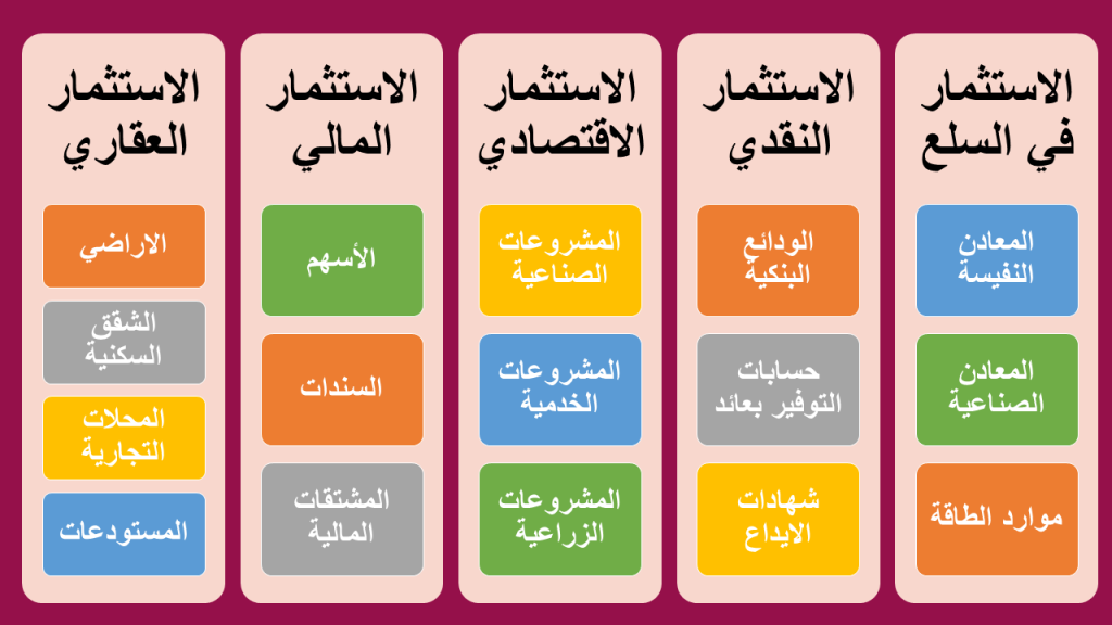 • الاستثمارات المحلية  و تضم جميع الفرص الاستثمارية المتاحة في السوق المحلية بغض النظر عن نوع اداة الاستثمار المستخدمة سواء أصول مالية او حقيقية