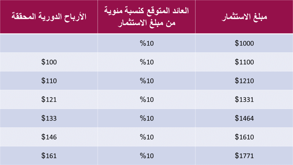 التضاعف المركب او التراكمي للاستثمار من خلال إعادة استثمار الارباح