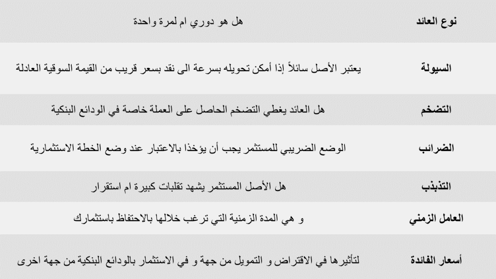 • تقييم العوائد المتوقعة للفرص الاستثمارية المقترحة يجب على كل مستثمر أن يقوم بعملية تقييم لهذه العوائد،، متى سوف احصل على هذه العوائد، كم من العوائد بشكل نسب مئوية أو برقم عشري من مجموع رأس المال العامل