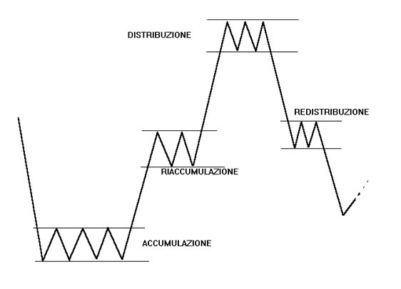 • التوزيع – في المرحلة الثالثة ، يستمر الجمهور في التكهن ، ولكن الاتجاه يقترب من نهايته. يبدأ صانعو السوق بالتخلص من صفقاتهم ، أي عن طريق البيع للذين لم يدركوا بعد أن الاتجاه على وشك الانعكاس.